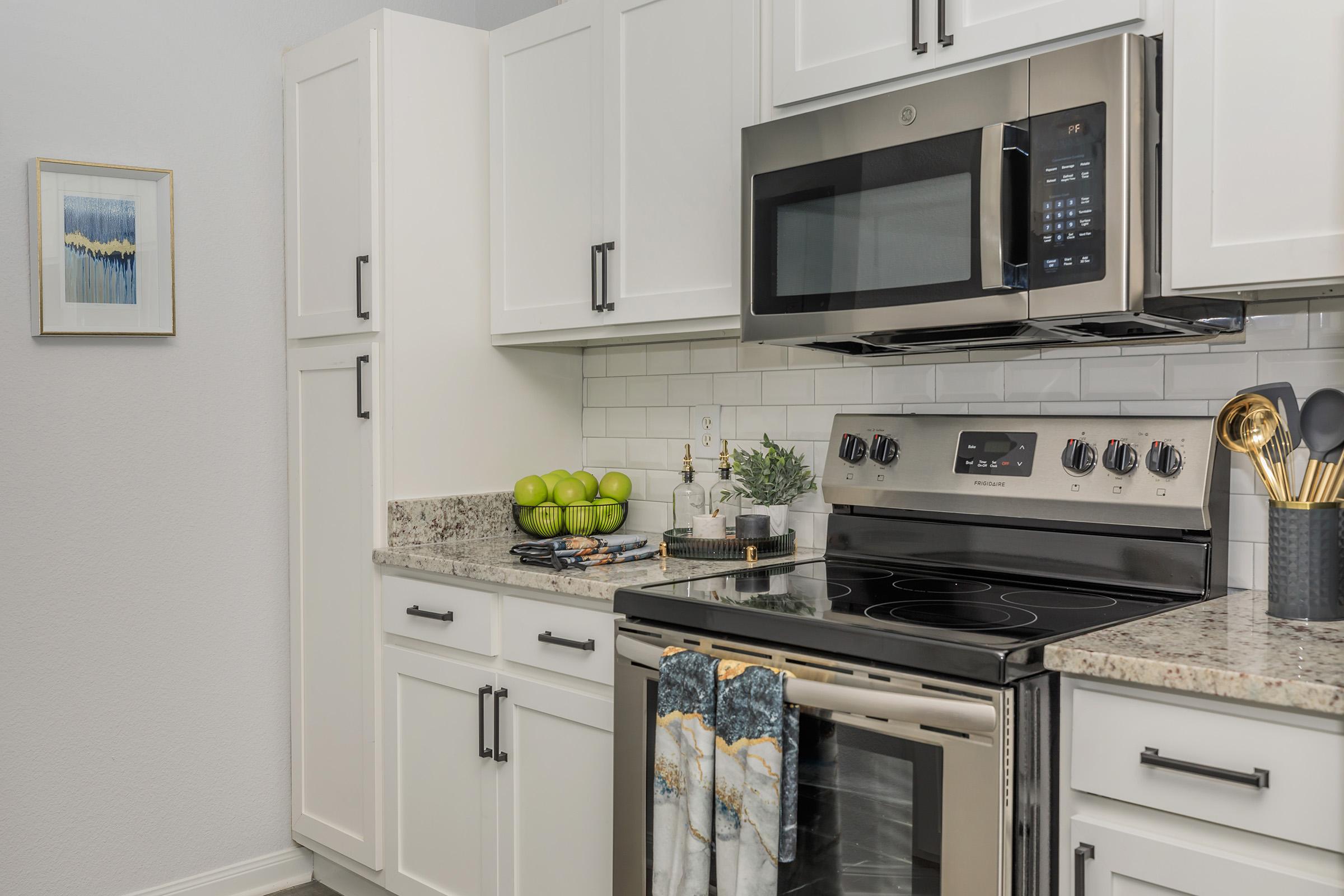 Explore our seven designer floor plans within our one, two, and three-bedroom apartments for rent. Each home has modern cabinets, stainless steel appliances, and a washer and dryer. Select residences have dual sinks in the main bath, plank flooring, and a wood-burning fireplace. Your perfect apartment is waiting for you at Wildwood Forest.
